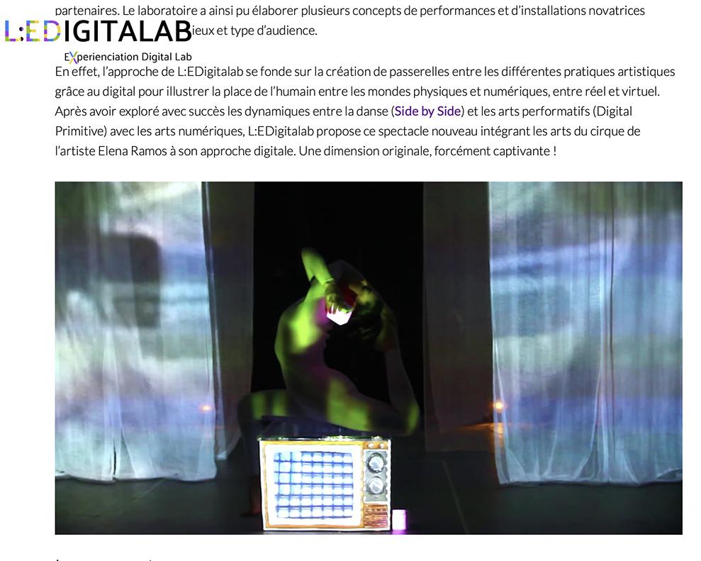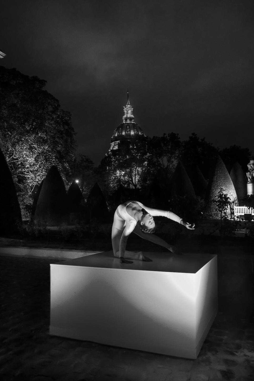 Elena Ramos produces solo creations for Louis Vuitton, Givenchy, Guerlain, Dior, Hermès, Chopard, Pourchet, IFF, Les Galeries Lafayette, Triumph, Puma, BMW, Mercedes, Porsche, Susuki. She has performed at the Cité des Sciences et de l’Industrie de la Villette, at the Hôtel de Ville in Paris, at the Orangery of Versailles for Perrier-Jouet, at the Louvre Museum for l’Oréal Univers, at the Rodin Museum , at the Palais de Tokyo, at the Musée d’Orsay, at the Espace Pierre Cardin, at the Palais des Festivals in Cannes. She is a model for the magazines Faust, Vogue, Wallpaper, Metal, Lampoon, Paris Match, Shoesup, and for the clip An easier affair by George Michael.