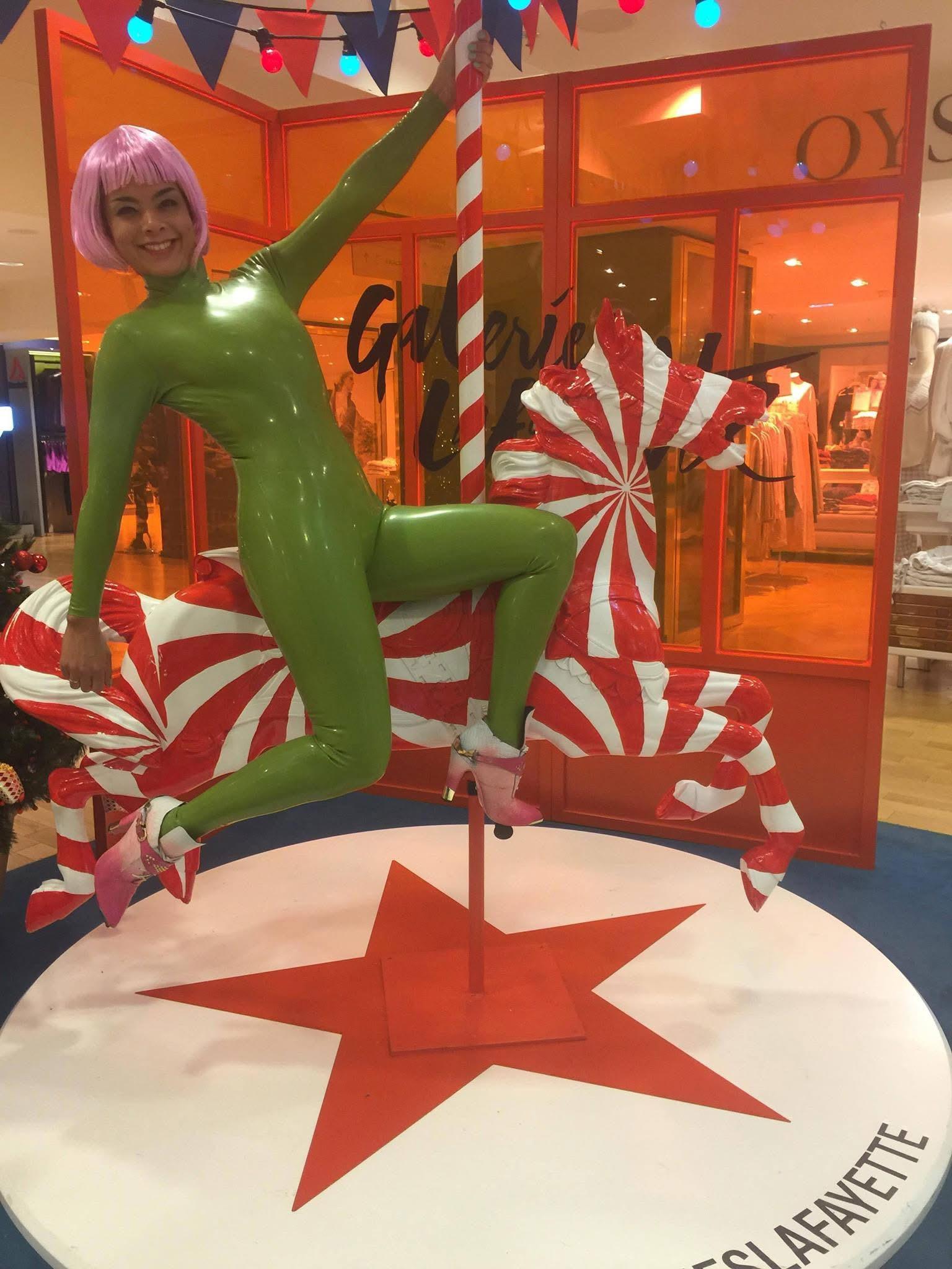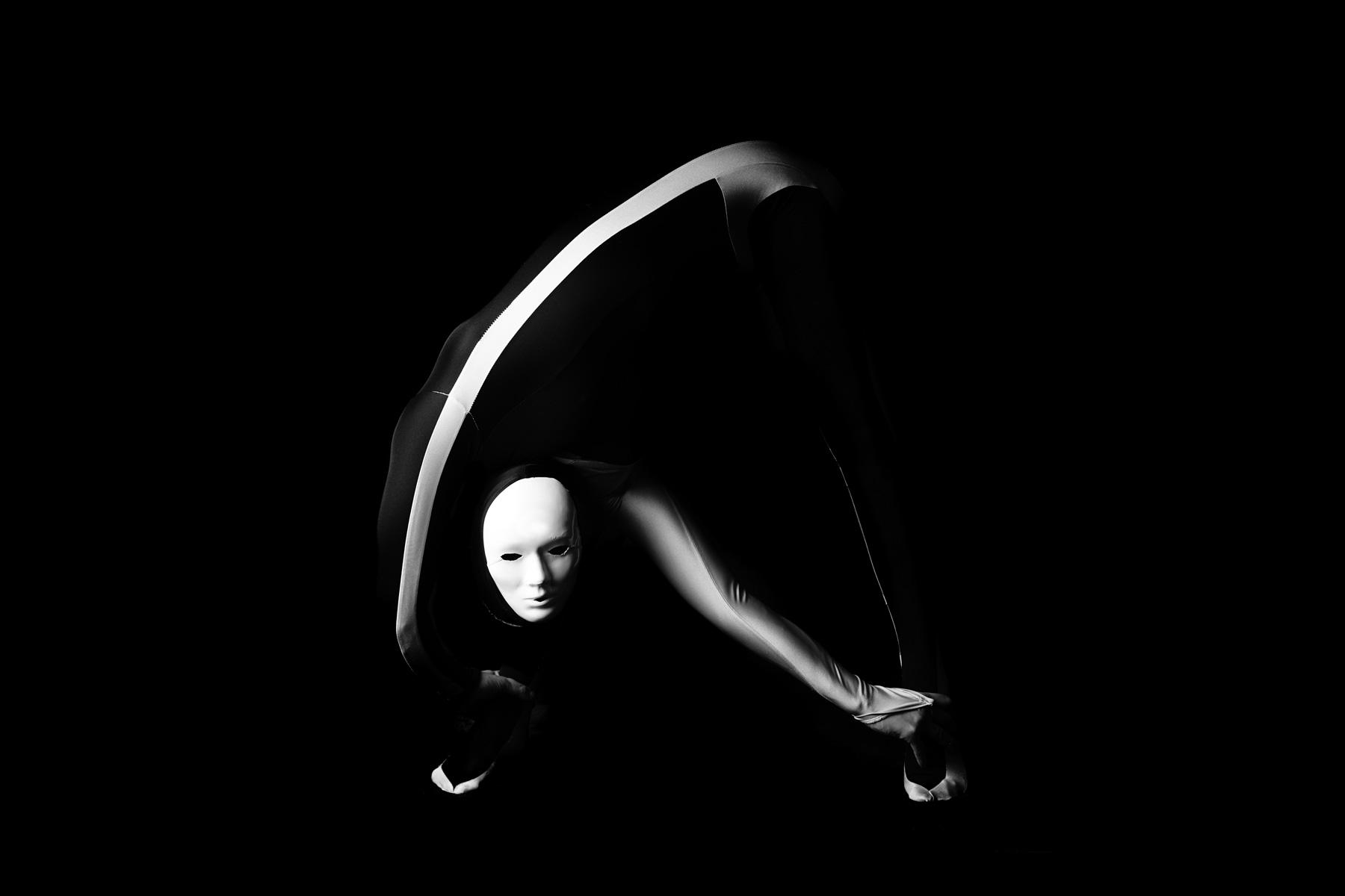 est une créature contorsionniste masquée qui s’étire de façon étonnante sur un podium ou une installation pendant 1 heure.