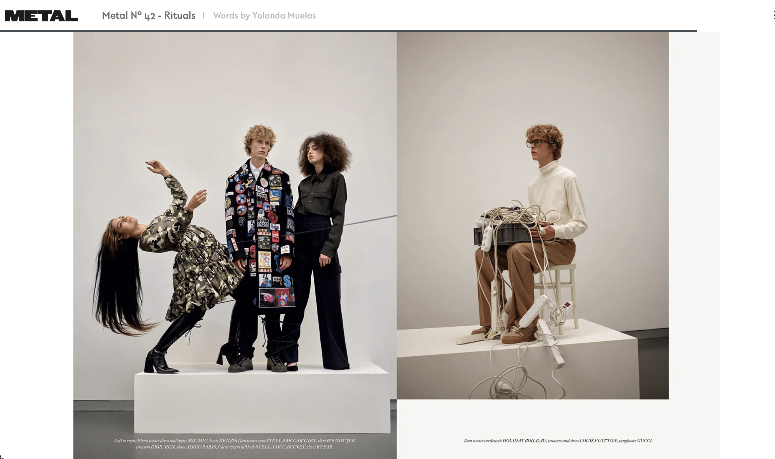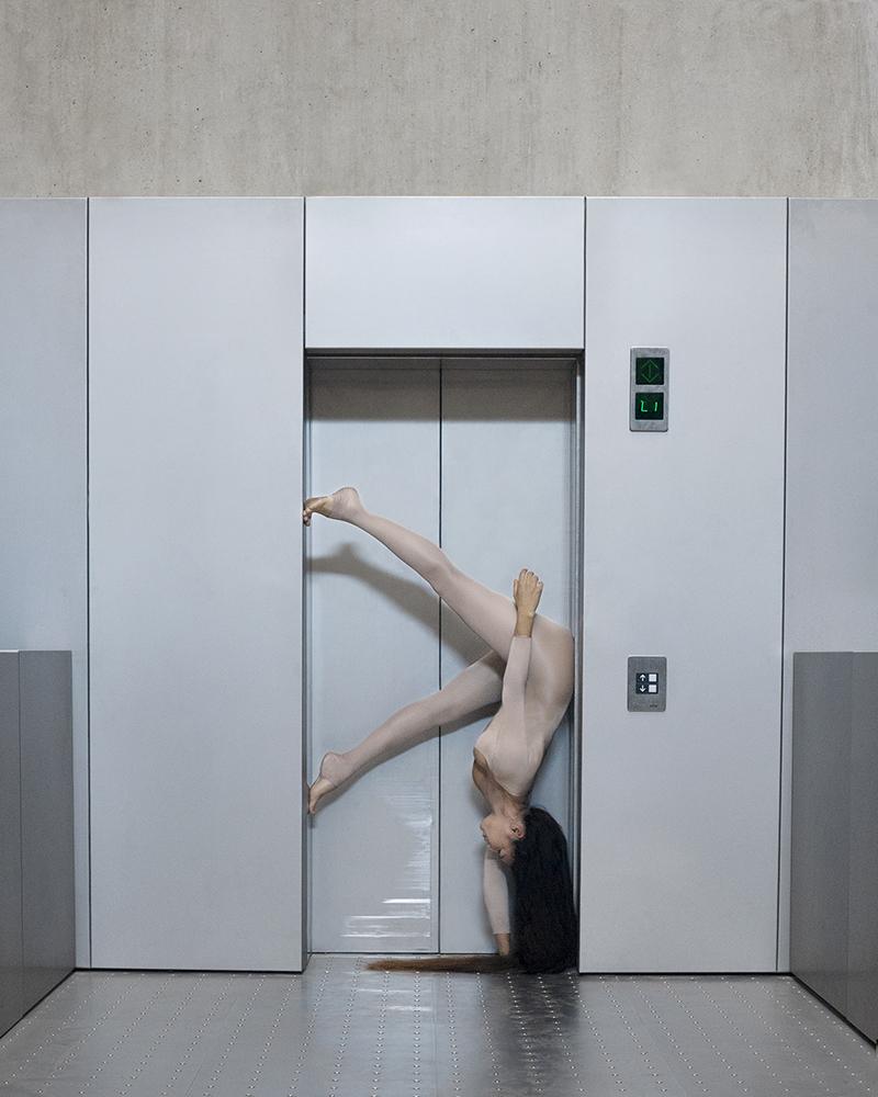 Integrating haute couture with excellence in body skills is obvious. Elena Ramos works on fixed positioning, the sculptural, the movement of the drawing in volume contained within stillness. Photography is the medium that borrows the same logic of freezing the gesture. The contortionist posture installed in the image finds in photography and self-portraitism the ideal base.